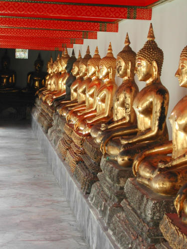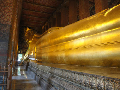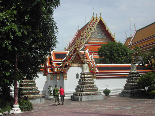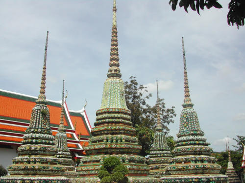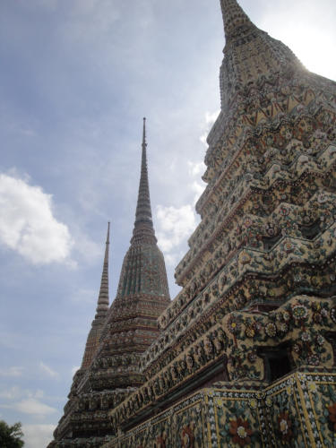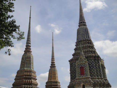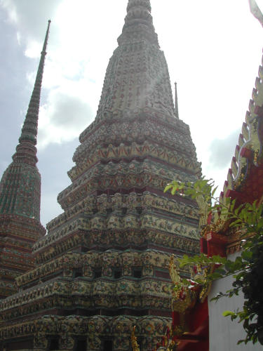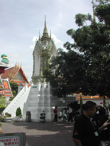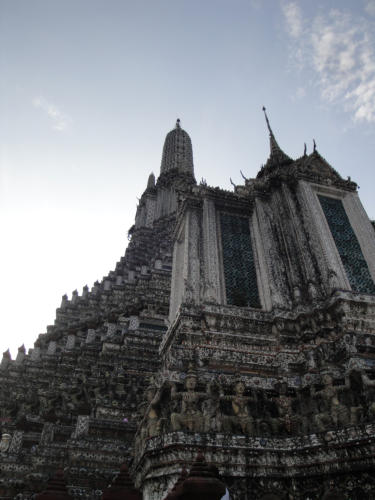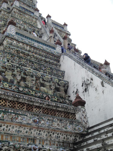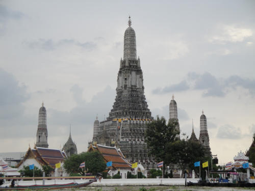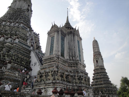 Tempel der Morgenröte. Man kann den 80 Meter hohen Turm Phra Prang hinaufsteigen und hat von dort einen fantastischen Blick auf den Chao Phraya, den Königspalast und die Skyline von Bangkok.