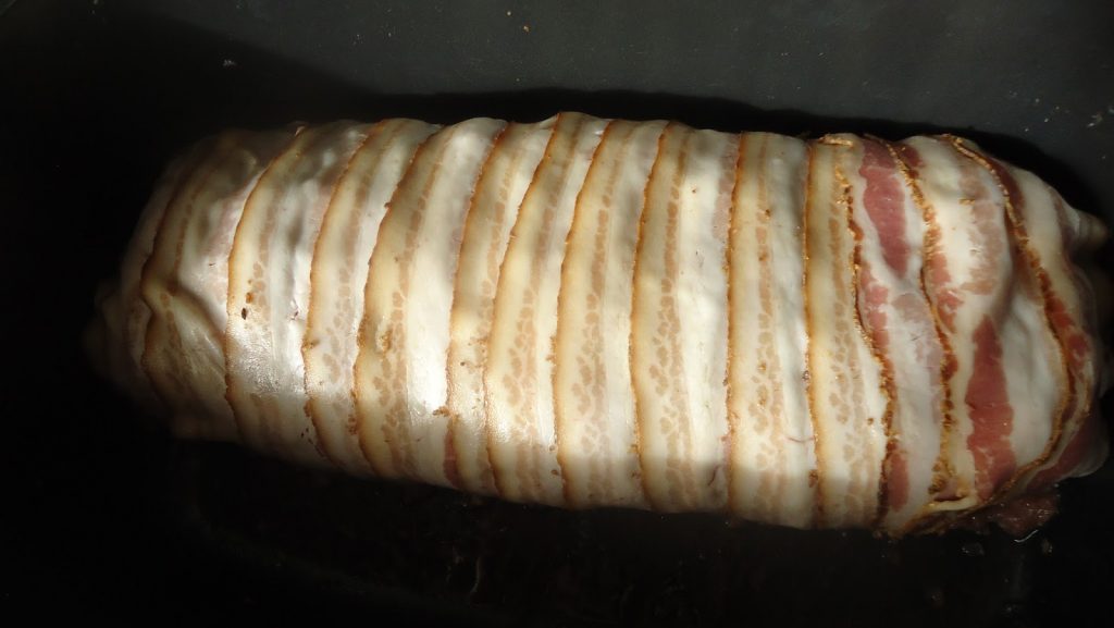 Zutaten : 1 Kg Hackfleisch gemischt 4 Eier 1 - 2 gehackte alte Brötchen ca. 100 ml lauwarme Milch 3 Karotten 2 Zwiebeln 3 Eßl. Senf Salz, Pfeffer, Majoran, Muskat Speck in Scheiben zum umwickeln.