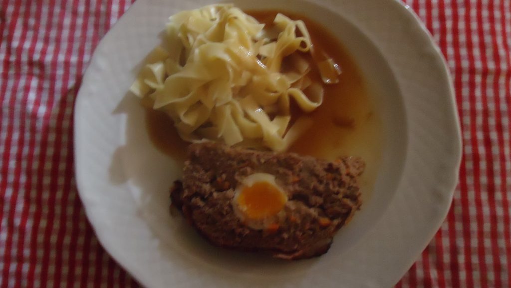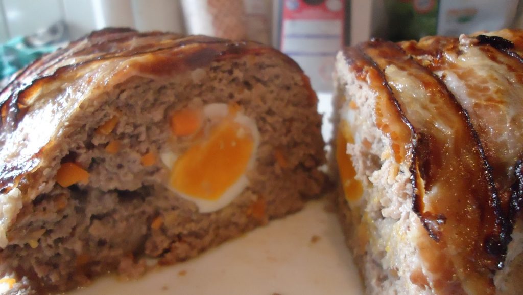 Die zerkleinerten Brötchen in etwas lauwarmer Milch einweichen Backofen auf 200 Grad vorheizen. Das Hackfleisch in eine Schüssel geben. Die aufgeweichten Brötchen (wenn nötig Milch ausdrücken ) zum Hackfleisch geben Zwiebeln und Karotten klein schneiden ( nicht zu grob) und auch in die Schüssel geben. Majoran, Muskat, Senf und 1 Ei, Salz und Pfeffer hinzugeben und alles gut vermischen. Die Masse beiseite stellen und ziehen lassen. Inzwischen 3 Eier wachsweich kochen und schälen. Die Hackfleischmasse aus der Schüssel nehmen und auf der Arbeitsplatte leicht platt drücken. Die gekochten Eier längs hintereinander platzieren und das Hackfleisch um die Eier herum zu einem Laib formen. den Speck fest herumlegen. In eine Längliche Bratform geben.