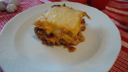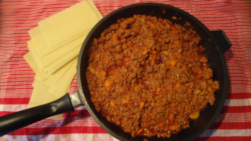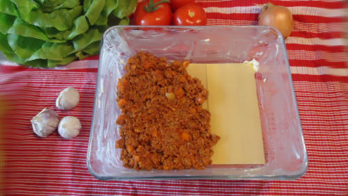 Dann kommt eine Schicht Bolognesesosse über die Platten