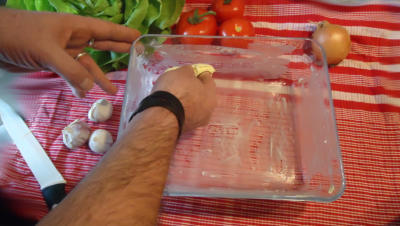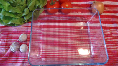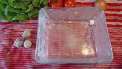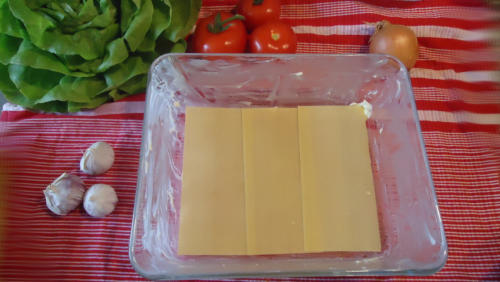 Eine Lage Lasagne Platten auf dem Boden der Auflaufform auslegen.