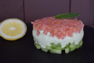 Den Lachs in feine Würfel schneiden, mit dem Zitronensaft abschmecken……..